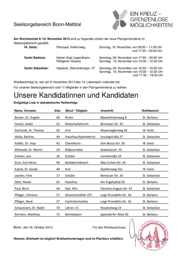 Wahlberechtigung: alle Mitglieder unserer Pfarreiengemeinschaft, die am 8. November 2013 das 14. Lebensjahr vollendet haben